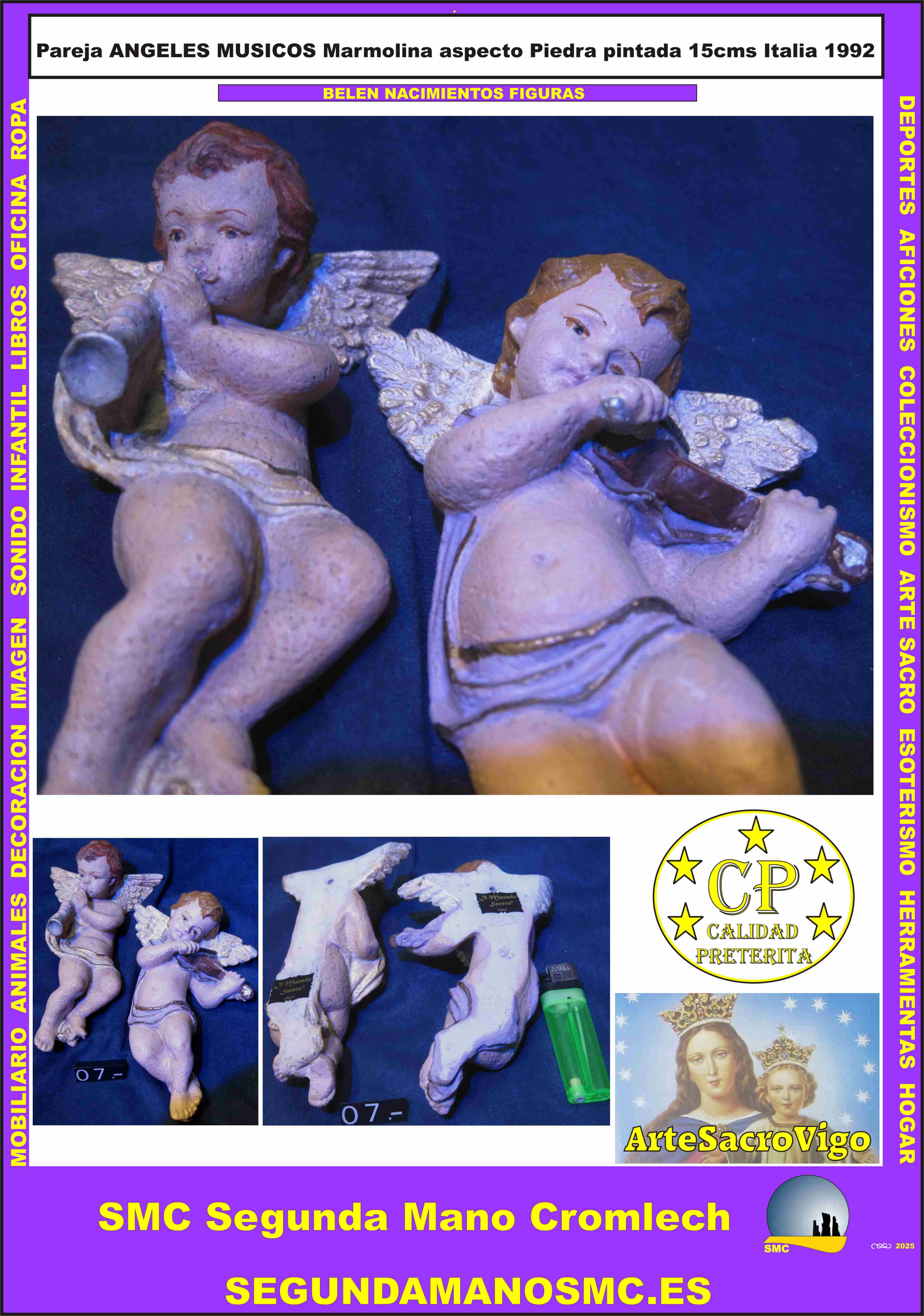 Pareja ANGELES MUSICOS Marmolina 15 cms Acabado envejecido Italia 1992