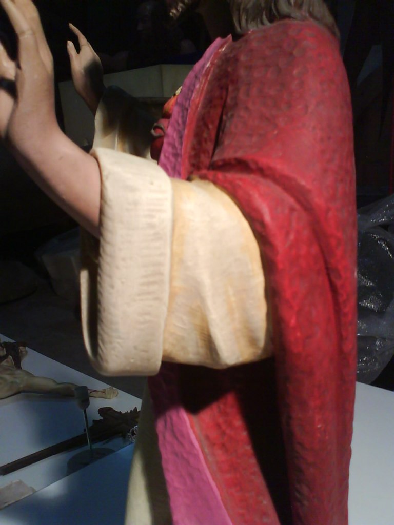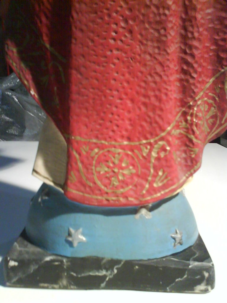 Procede del taller de Restauración de la tienda Religiosa ARTE SACRO MARIA AUXILIADORA de Vigo,(cerrada en el 2002) donde se le iba a reparar los dedos y las faltas de pintura.