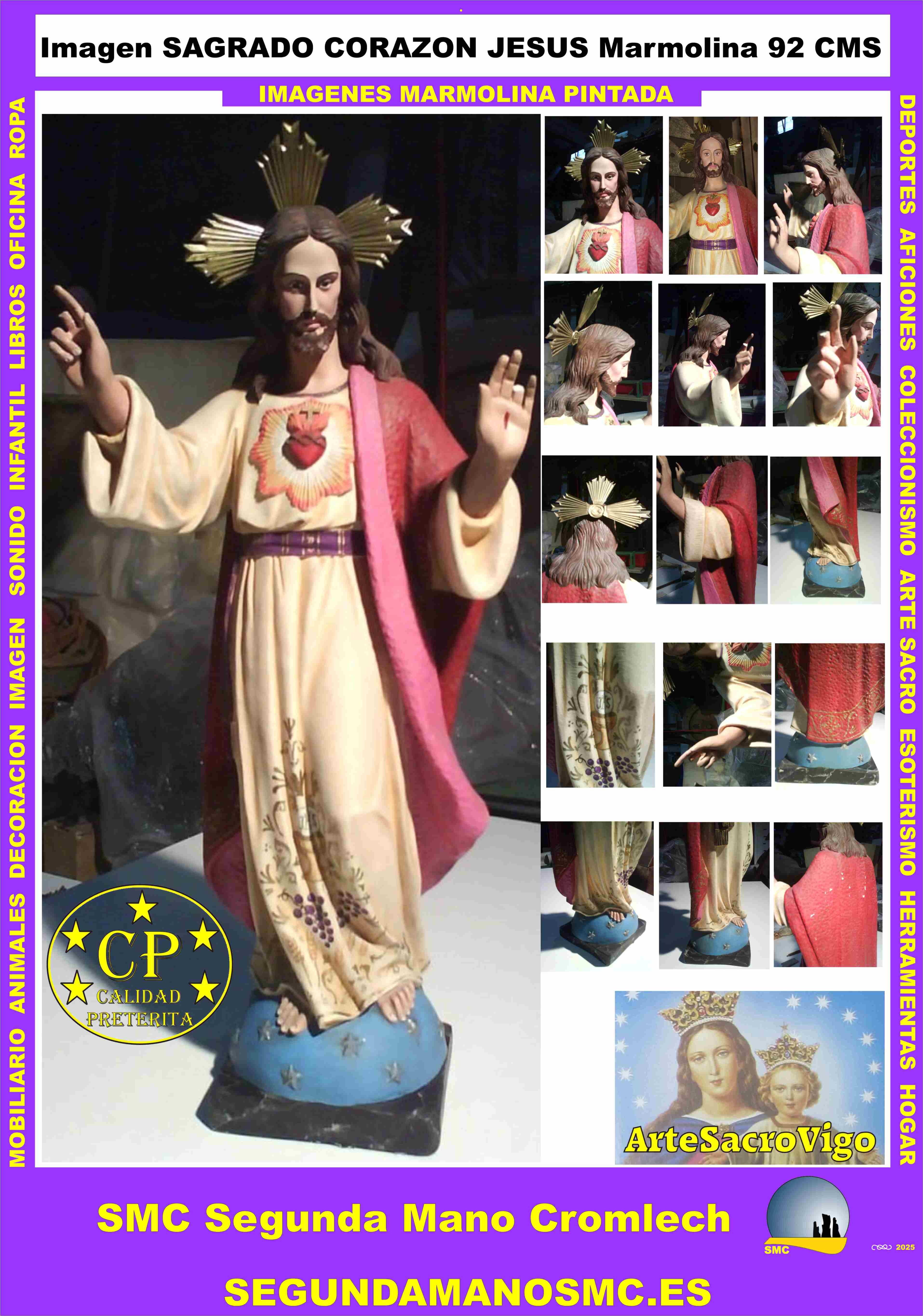 Imagen SAGRADO CORAZON DE JESUS 92 cms altura total. Marmolina maciza Decorada